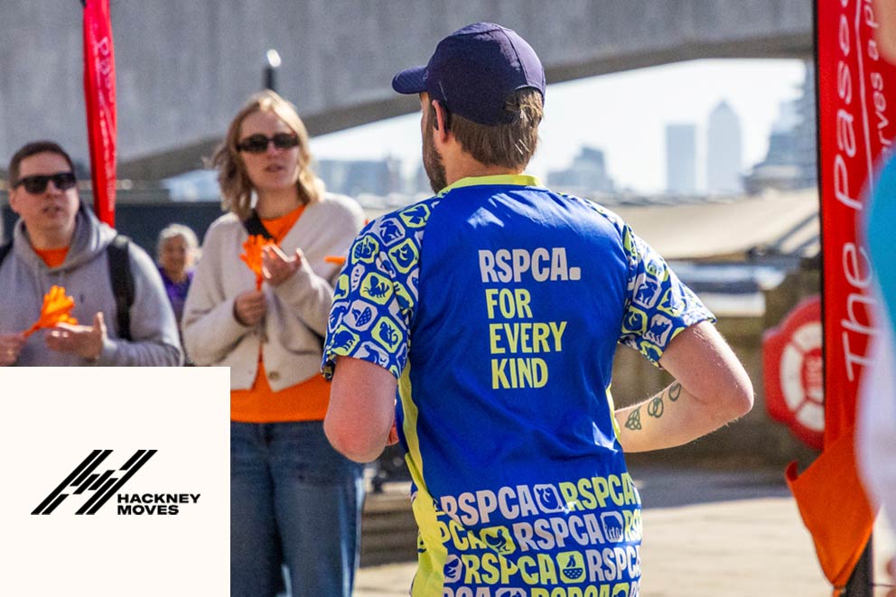 An RSPCA fundraiser wearing a white t-shirt and RSPCA running vest taking part in a charity running event.