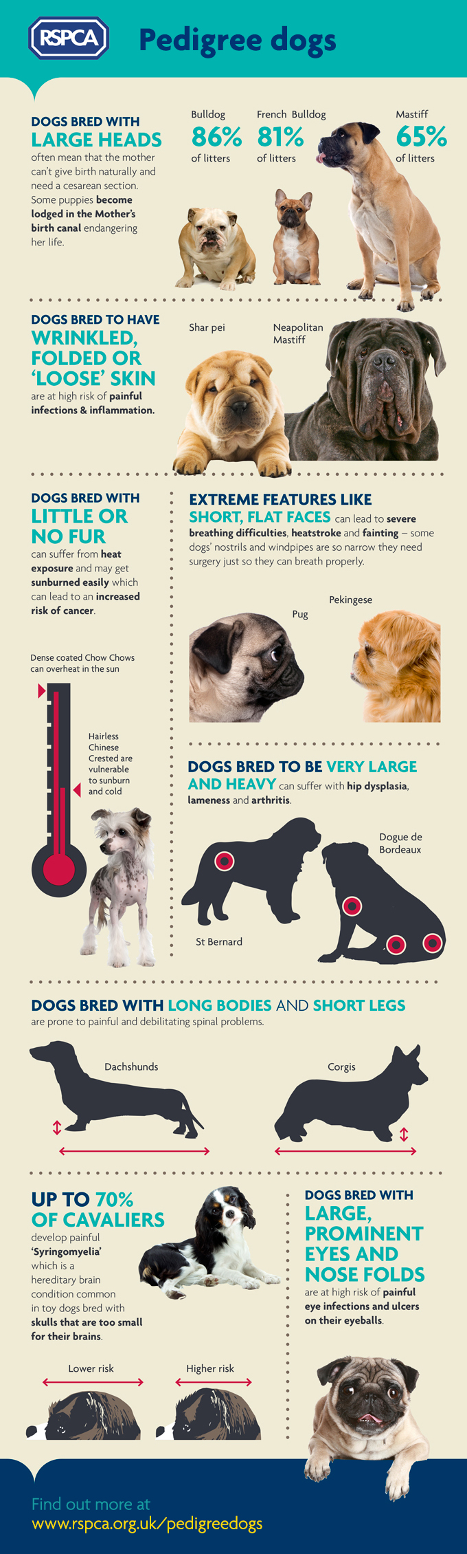 Below are examples of problems that pedigree dogs can suffer from as a result of selective breeding range from irritating to life-threatening issues, or those that require risky surgery.