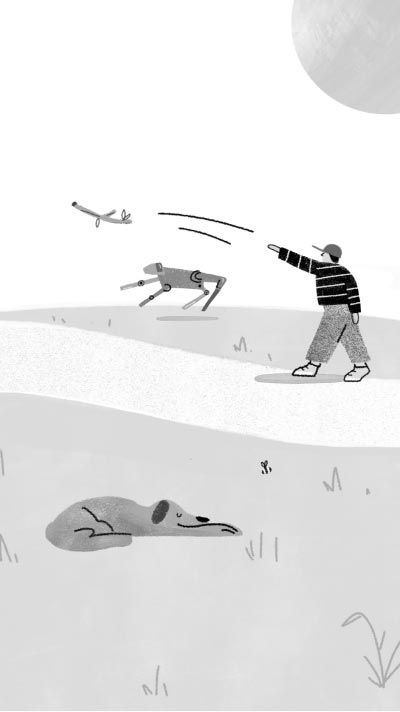 Judith Donath, in her essay The robot dog fetches for whom? describes a boy playing fetch with a robot dog. She writes: